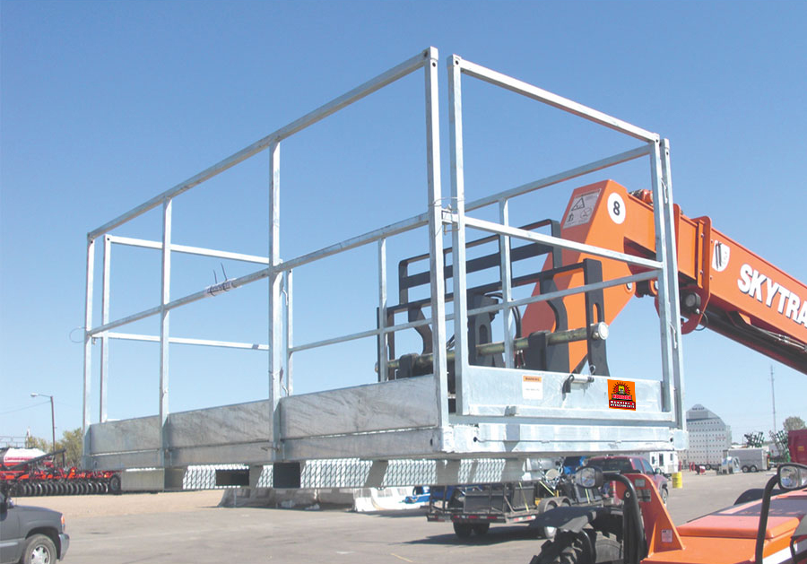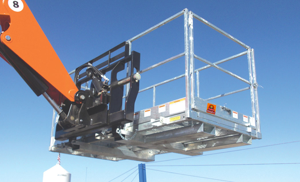 The width of the Telehandler Work Platform floor is a spacious 50" between the safety rails.